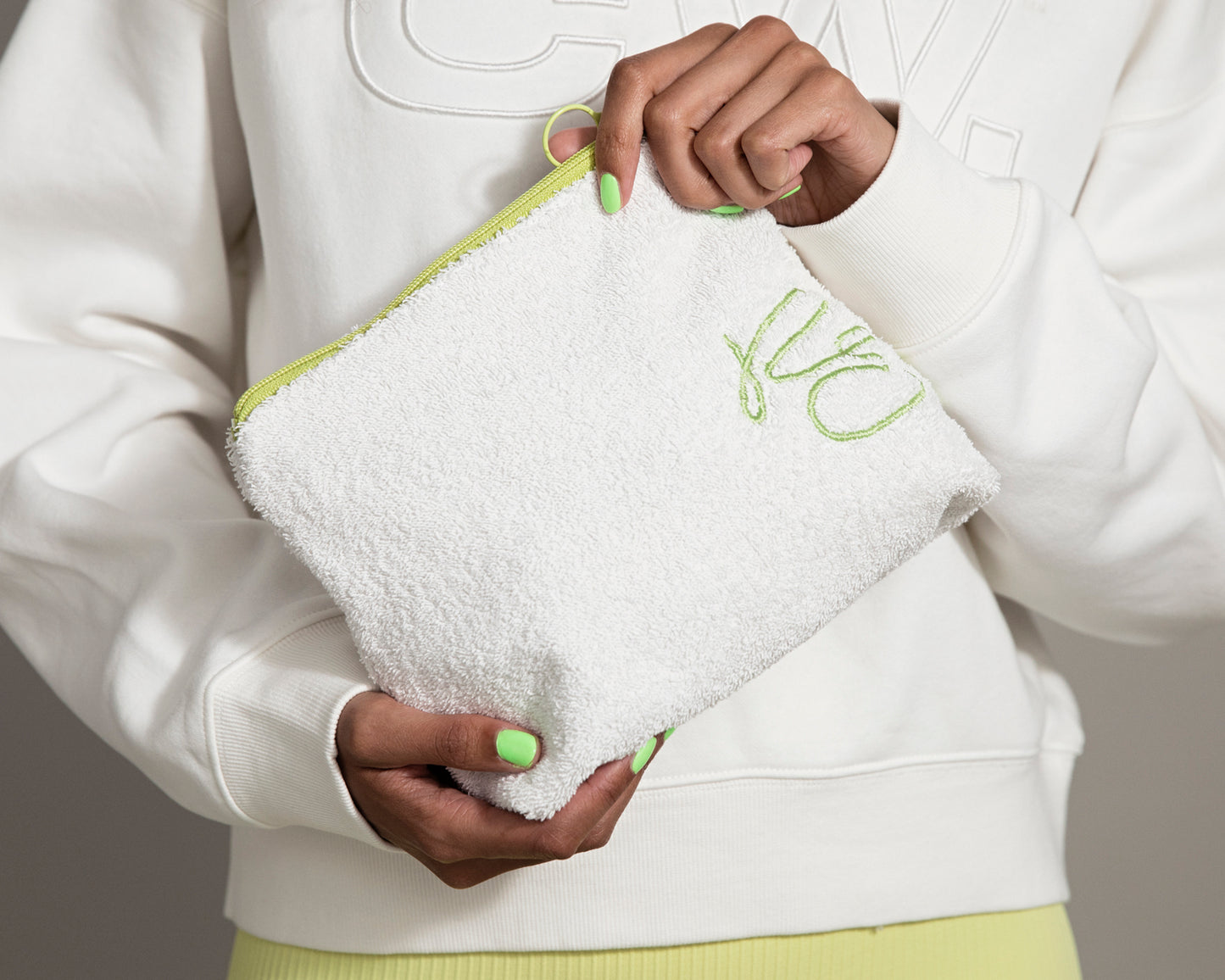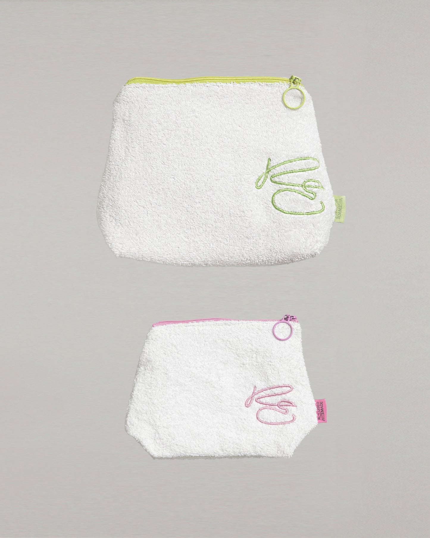 Perfect bags to fit all of your beauty products. Features embroidered logo and top zipper closure. Fully lined with reused hotel bed linen.